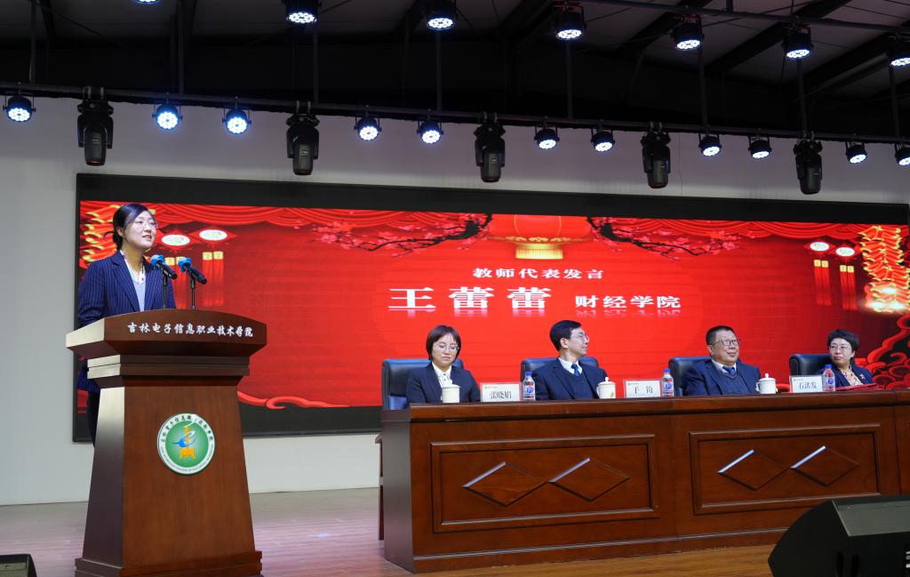财经学院王蕾蕾代表教师发言。表示全体教师将潜心钻研、用心教书,教育引导学生厚植爱校荣校情怀,练技能、长本领、做贡献。同时表达对学校60周年华诞的深切祝福。