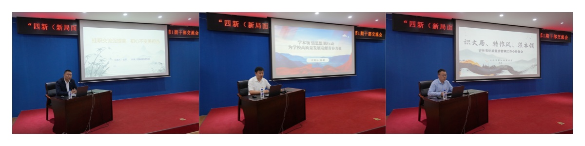 会上,马克思主义学院党总支书记、院长侯君作题为《挂职交流促提高 初心不变勇担当》的交流发言;党政办公室行政科科长杨超作题为《学本领 悟思想 践行动 为学校高质量发展贡献青春力量》的交流发言;纪检监察机构审理室副主任朱洵作题为《识大局 转作风 强本领》的交流发言。3名干部结合外派工作实际,从不同角度交流工作经验、畅谈体会感受。