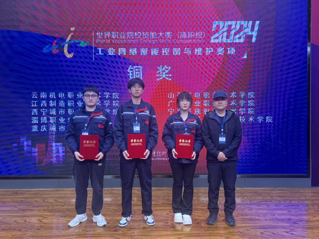 10月25日至26日,2024年世界职业院校技能大赛高职组“工业网络智能控制与维护赛项”总决赛争夺赛在包头职业技术学院举行,来自全国30个省、自治区、直辖市和新疆生产建设兵团的60支代表队、212名选手同台竞技。经过激烈角逐,我校钱海月、尤彦江两位老师指导的果依林、于东博、刘一霏三名同学组成的参赛队荣获铜奖。